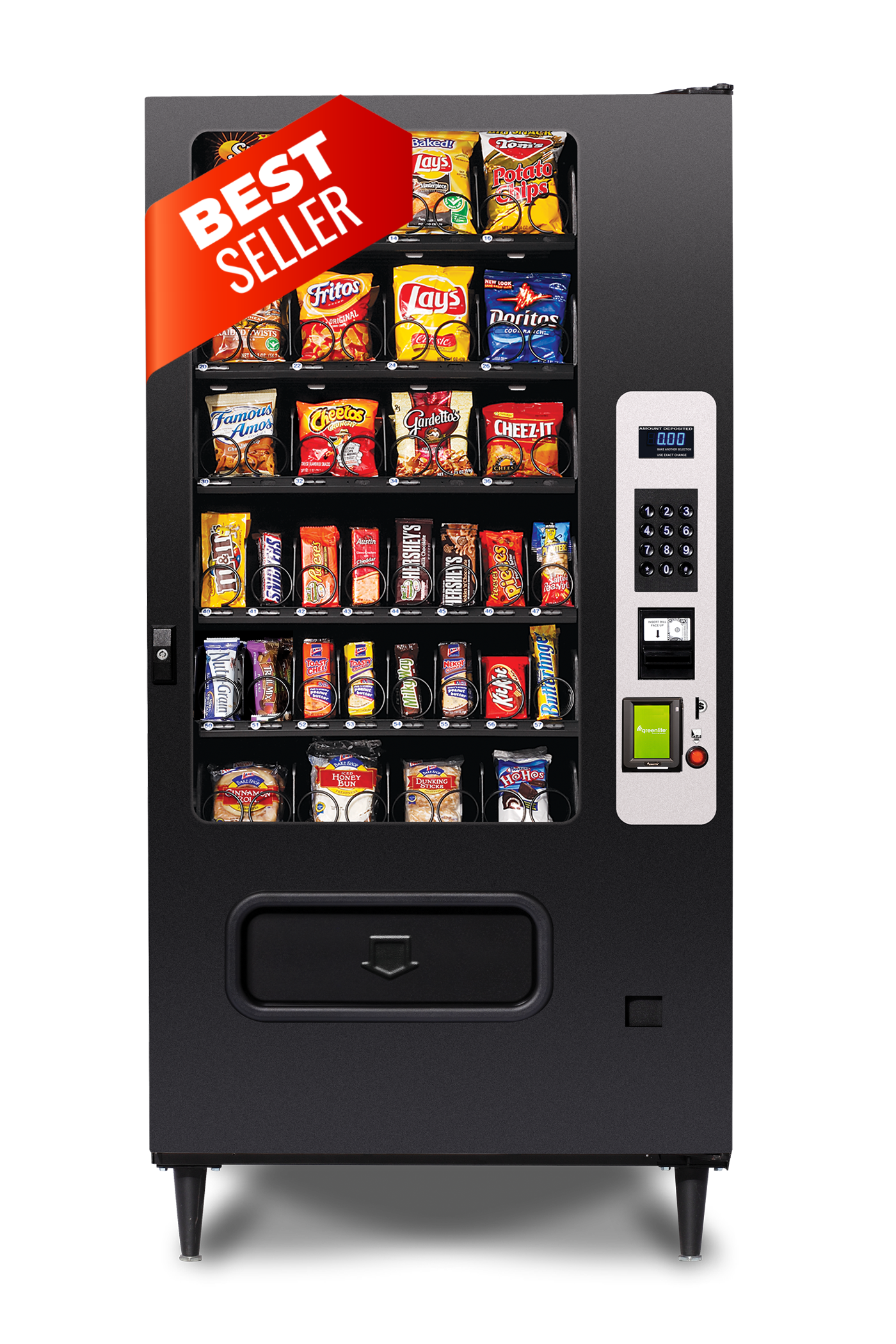 This 32 selection Snack Food Vending Machine comes configured with 12 selections of chips, 16 selections of candy, sandwich cracker, gum & mint, plus 4 pastry selections. Standard dual augers promote proper vend position and our iVend® Delivery Sensor System ensures your customers receive their simple vending snack or their money back.