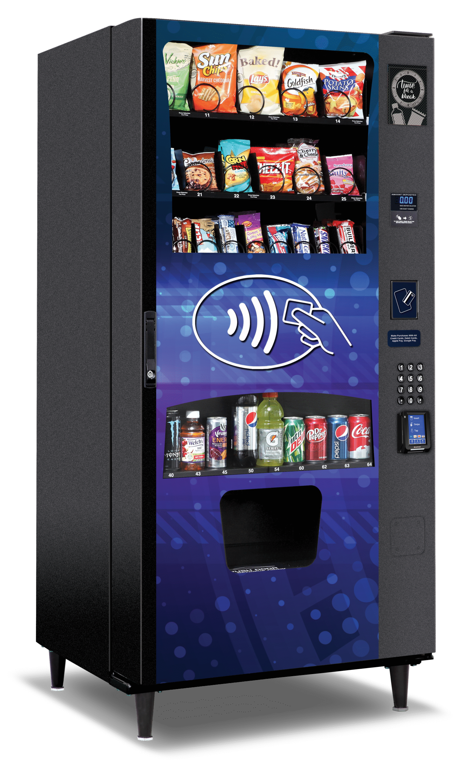 Easily accommodate ALL major credit cards, debit cards, and mobile wallets, including Apple Pay and Google Pay with the NEW ePay Combo Vending Machine. Equipped with the Greenlite Cashless System, the ePay Combo Vending Machine is a cashless electronic payments only machine.