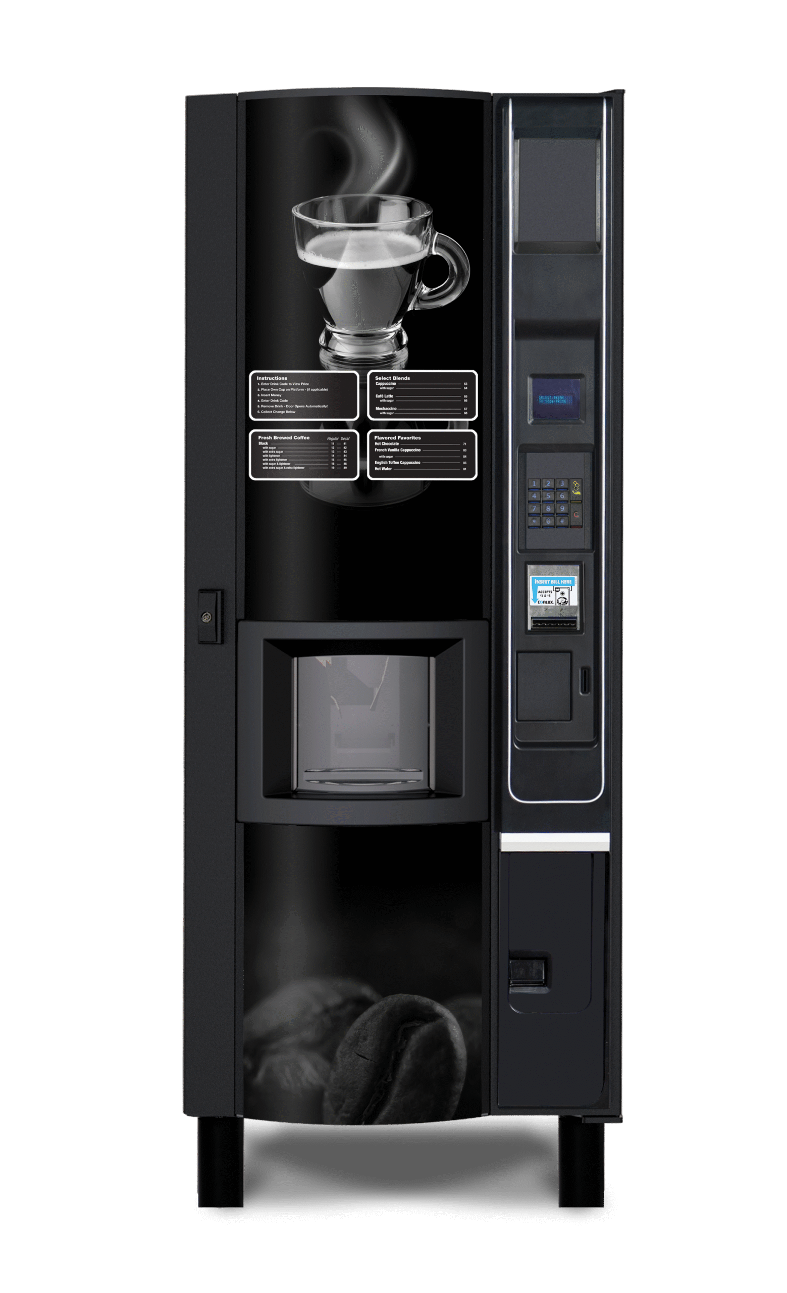 The MarketOne Hot Drinks Vending Machine for coffee, tea, and more features a European-design, state-of-the-art brewing system and filter system for precise ingredient controls to ensure a high-quality cup with superb taste, aroma, color and appearance is delivered each and every time. Bring the European café experience to your customers with barista-quality hot beverages from the MarketOne Coffee hot beverage and coffee merchandiser. Available in freeze-dried and fresh brew models, the MarketOne Coffee dispenses a broad menu of premium and specialty hot beverages, serving them just the way your customers like them. In fact, the MarketOne Coffee hot beverage and coffee merchandiser offers a comprehensive range of 11 core hot beverages with a total of 34 hot beverage combination options of coffee, specialty coffee, hot chocolate, tea, cappuccino and espresso.
